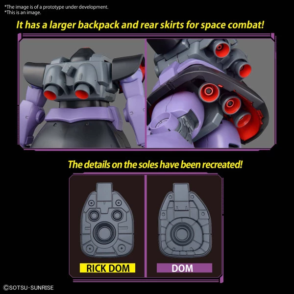 The newest features included are a larger backpack and rear skirts for space combat! The details on the soles have been recreated to include the unique footprint of the Rick Dom. Recreate your favorite moments of Rick Dom flying through space with all of its powerful weapons!