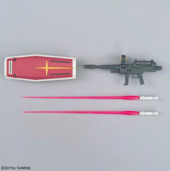 Set Contents: RX-78-2 Gundam, 2 Beam Sabers, Manipulators, Multipurpose weapon-holding (1 pair), Trigger-finger (right), Open-palm (right), Beam Rifle, and a Shield.